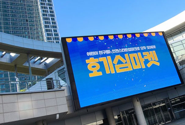 실외 대형현수막은 높은 밝기로 설치하며 방수/방진가 필수 입니다. 주로 타포린/벽면/지주형 구조물에 설치 합니다.