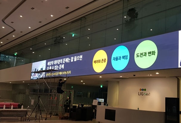 실내 대형현수막은 눈부심 최소화를 위해 발기 조절이 가능하며 로비/매장/무대 배경으로 사용되며 고해상도를 설치 합니다.